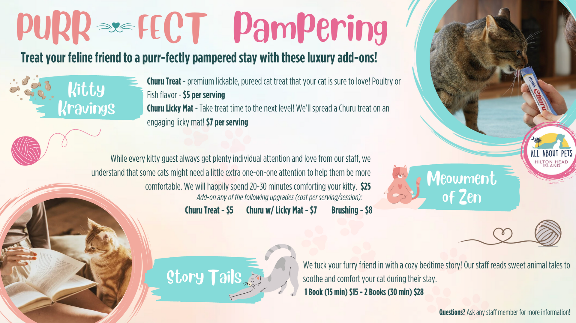 AAP is the only cat boarding facility on Hilton Head to offer each special kitty their own spacious cat townhouse. Each space has a comfy bed, cat tree and litter box area. The townhouses are multi-level with vertical and horizontal passages for active, climbing cat guests. The cat area overlooks our retail store, providing the cats with lots of interaction and entertainment throughout the day.